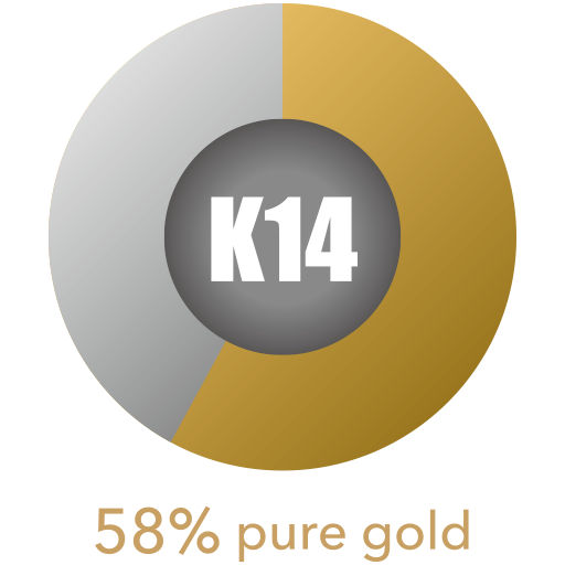 金含有率58.5%。強度に優れ、欧州などで人気があります。K18よりもやや控えめな輝きで、カジュアルなジュエリーに多く用いられます。