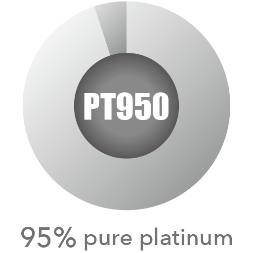 純度95%。変色や酸化に強く、金属アレルギーも起きにくい高品位素材。重厚な白い輝きと高い信頼性で、特別なジュエリーに最適です。